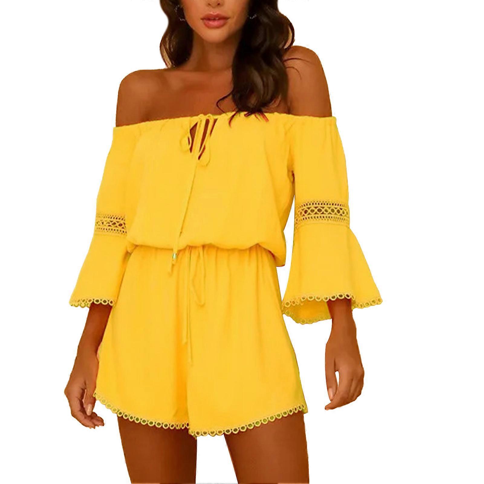 Women Loose Drawstring One Piece Shorts Off Shoulder Elastic Waist Stretchy Short Romper Jumpsuit Yellow S