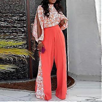 Women Fashion Round Neck Printed Slit Long Sleeve Wide Leg Pants Sets