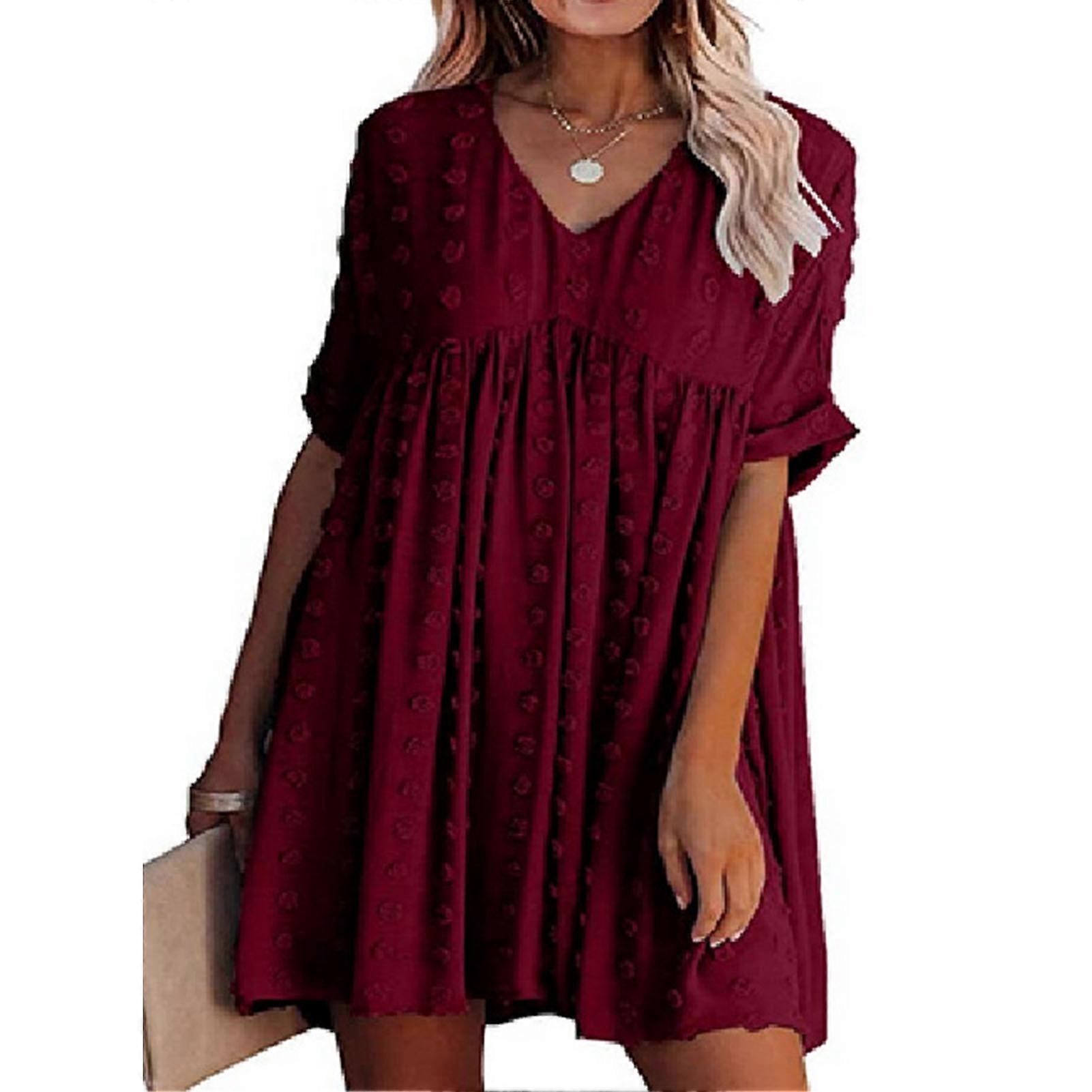 Women Short Sleeve Dress Swiss Dot High Waist V Neck Casual Style Summer Loose Dress Red M