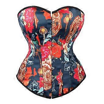 Womens Vintage Skull Floral Print Corset Bustiers Gothic Steampunk Sexy Satin Lace-Up Overbust Waist Cincher Hooks Front Shapewear Top S