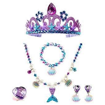 Girls Princess Necklace Bracelets Ear Clips Crown Set Mermaid Pendant Colorful Plastic Princess Party Dress Up Pretend Play 6pcs