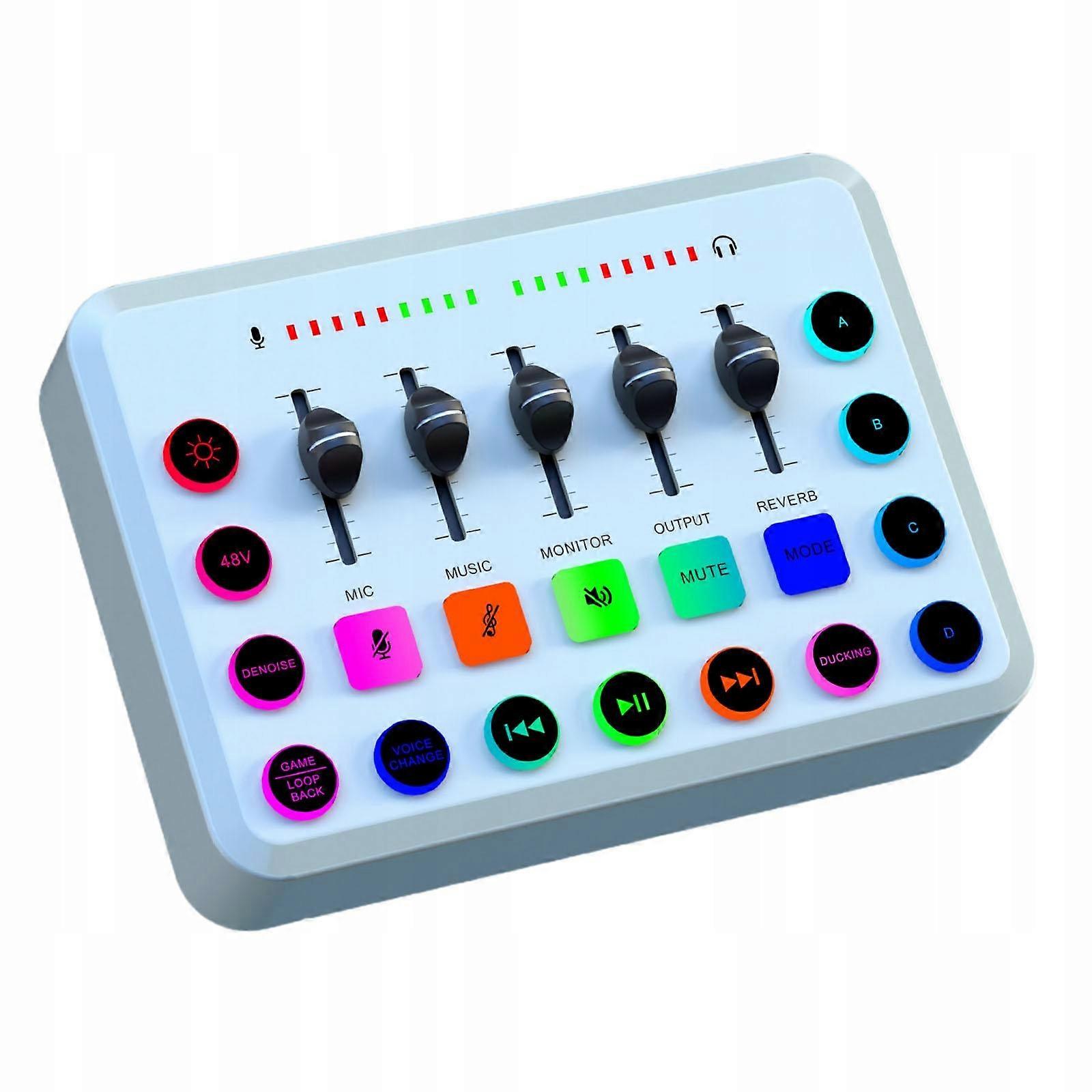 Gaming Audio Mixer Colorful Light Effect RGB Mixer PC for Vocal Recording White Description: [48V Power Supply]: The gaming audio mixer supports XLR interfaces and has built-in 48V power, suitable for most condenser microphones, providing clear stereo sound and high sound quality. [Individual control]: 5-channel audio mixer with volume dampers, independent volume control of different channels, gentle control, professional tuning, easy operation. [Multiple Sound Effects]: The sound card supports 4 pre-recorded buttons for convenience of use, saving more time. With mute and buttons, key to control, speak in real time and listen without interference. [Colorful Light Effect]: RGB computer mixer with colorful light effects, adding a cool atmosphere. The sound board has 4 inputs (2 microphones, 1 line input and 1 headphone input) and 2 outputs (1 headphone output and 1 line output), and also supports Bt connection to avoid cumbersome wiring. [Wide Applications]: DJ mixer with high capacity of 1800mAh, can be charged during operation, fully charged in just 2 hours. Suitable for podcasts, vocals, voice in games, etc. Specification: Product Size: 16,7 cm x 12,3 cm x 4,8 cm / 6,57 inch x 4,84 inch x 1,89 inch Material: The package includes: 1 Gaming Audio Mixer