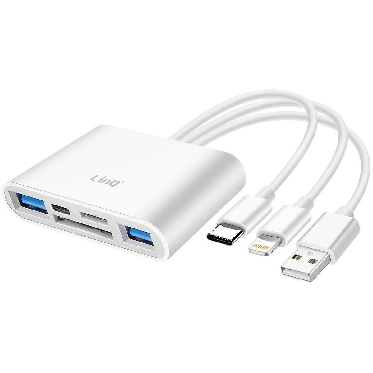 LinQ 3-in-1 card reader with triple USB-A, USB-C and Lightning connector. Reads SD, microSD and 2 USB ports. Fast transfer speeds of up to 480 Mbps. Can be recharged while in use via the Lightning port. Compact, compatible with Windows, Mac, iOS and Android. Driver-free operation.