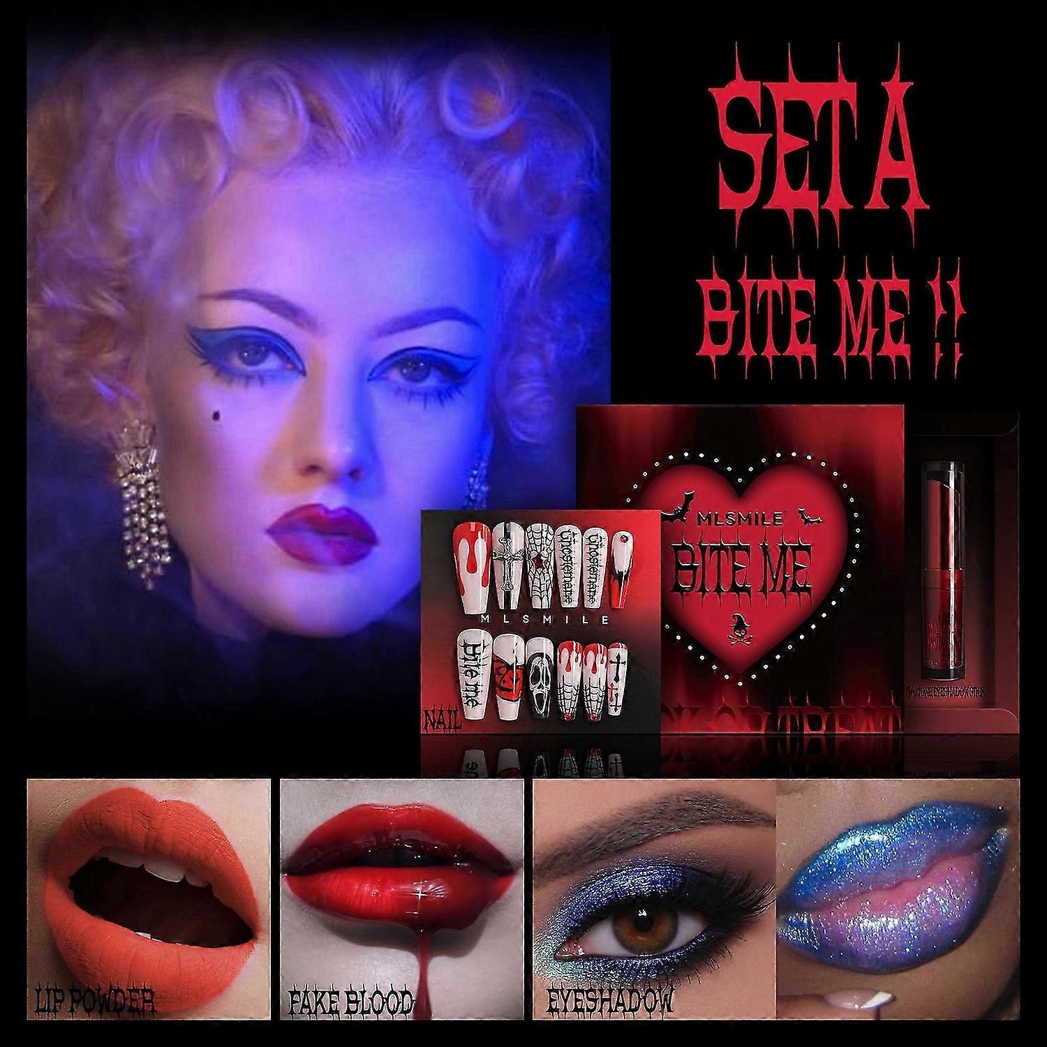 Halloween Makeup Kit, Matte Soft Mist Lipstick, Halloween Wear Press On Nail, Fake Blood Two Tone Eyeshadow Daring Makeup Set Halloween Party Supplies