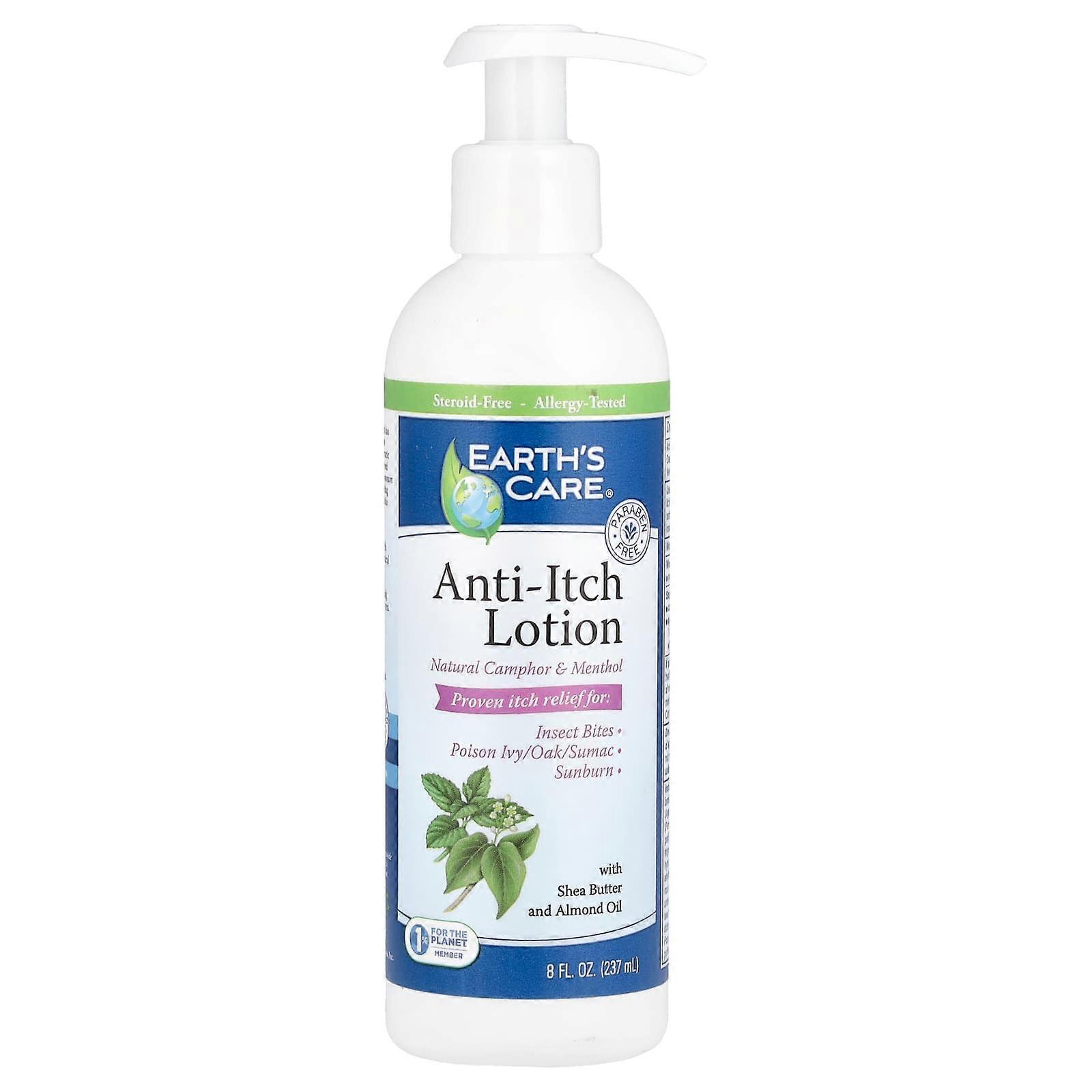 Steroid-FreeAllergy-Tested Paraben Free Natural Camphor & Menthol With Shea Butter and Almond Oil  Proven Itch Relief for:  Insect BitesPoison Ivy/Oak/SumacSunburn  Origins: Natural Menthol, which has been used for centuries, is sourced from peppermint and other mint oils. Its aromatic companion—Natural Camphor—is derived from Asia’s camphor laurel tree (Cinnamomum camphora). Renowned for its skin-soothing properties, Almond Oil (Prunus amygdalus dulcis) is naturally rich in Vitamin E. Earth’s Care Anti-Itch Lotion is a powerful combination of Natural Menthol and Natural Camphor—two ingredients proven to alleviate itching. Menthol provides a dual cooling/warming effect while Camphor soothes the itchy area. Both work quickly and naturally to desensitize sensory nerves so the itch sensation is suppressed.  Suitable for daily use, this proprietary non-greasy formula contains no steroids, phthalates or parabens. No Animal TestingNo Artificial Colors or FragrancesNo Petrolatum Uses: For the temporary relief of pain and itching associated with minor skin irritations such as poison ivy/oak/sumac, sunburn, insect bites, and minor cuts and scrapes.