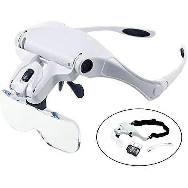 Head Magnifier with LED Light Hands Free Headband Magnifier for Sewing, Precision, Repair, DIY, 1.0X 1.5X 2X 2.5X 3.5X Easy and Effective Use: Quality magnifying glass with different magnifications (1x/1.5x/2.0x/2.5x/3.5x) Ideal for precision work (embroidery, engraving, drawing, small crafts, painting, model building, sculptures, and reading). 5 Interchangeable Lenses: The lenses are easy to attach and adjust. 5 interchangeable lenses in an efficient protective case, very practical and useful for choosing the desired magnification. Humanized and Adjustable: Magnifying glass with intense light and the easily adjustable glasses. The lenses are easy to change and move back and forth to find the perfect position for perfect vision and a comfortable working posture. 2 Ways to Wear on Head: Interchangeable headband for a secure and comfortable fit. Very easy to swap the frames for an elastic headband (included) with clips. Headlight and Magnifier: The LED light is adjustable and also a headlight illuminates the object very well. Powered by 3AAA batteries (NOT INCLUDED). If you don't need the light, remove the batteries for easy use.