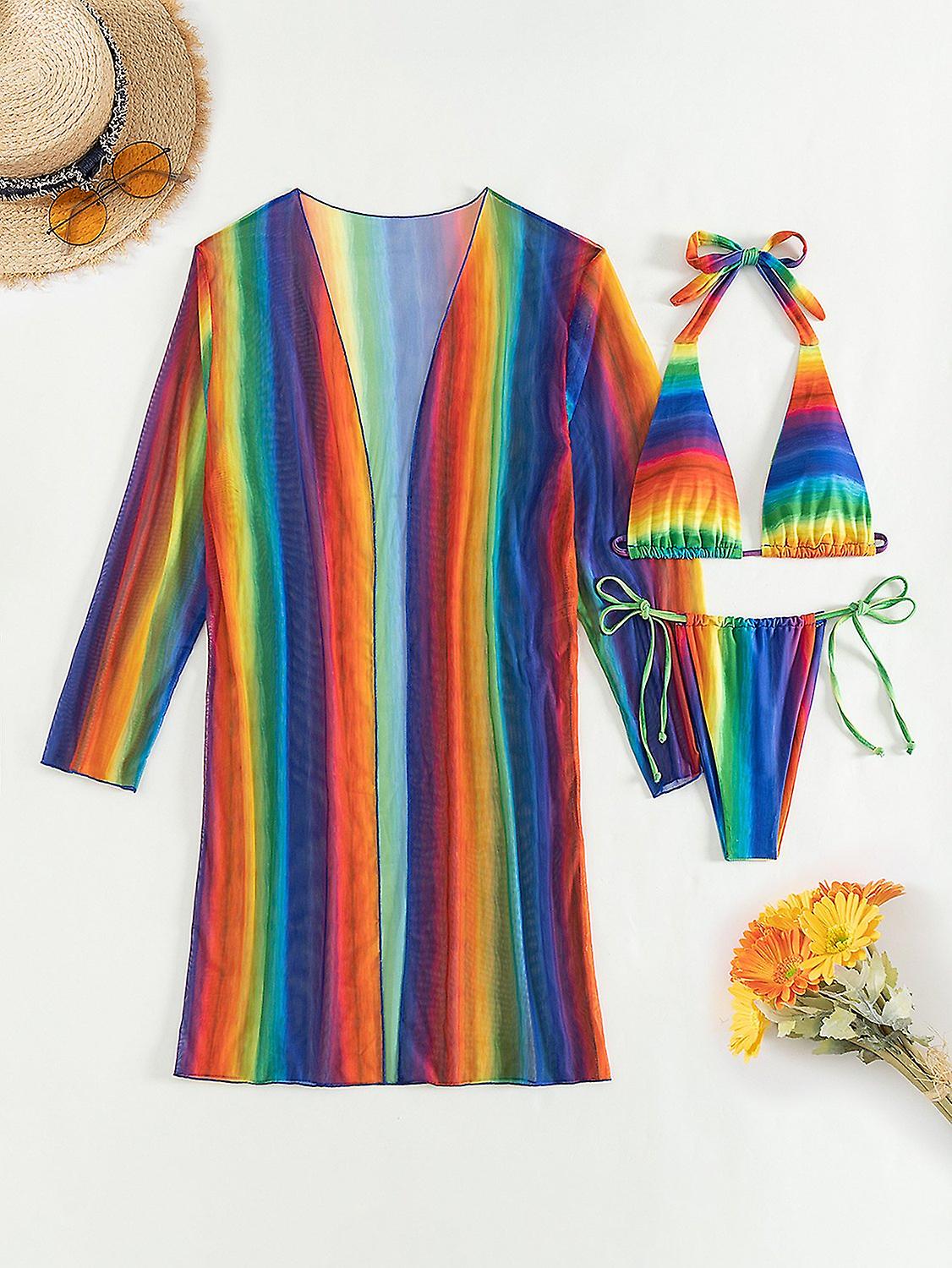Women's 3 Piece Swimsuits Tropical Push Up Bikini Sets Beach Long Sleeve Bathing Suits with Kimono C