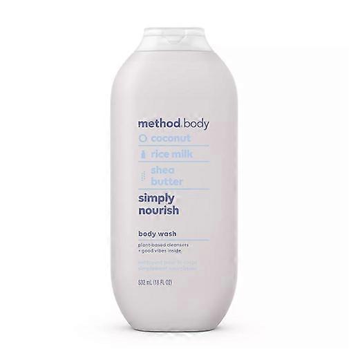 Method Body Wash Simply Nourish 18 oz Bottle Turn your shower into the kind of escape you need right now. Infused with coconut, rice milk + shea butter, this sumptuous body wash leaves skin feeling soft, moisturized + smelling like sweet comfort. Plus, with a cruelty-free, biodegradable formula, plant-based cleansers + a bottle (minus lid) made with 65% recycled plastic (PCR), the good vibes just keep going. Self care starts...now.