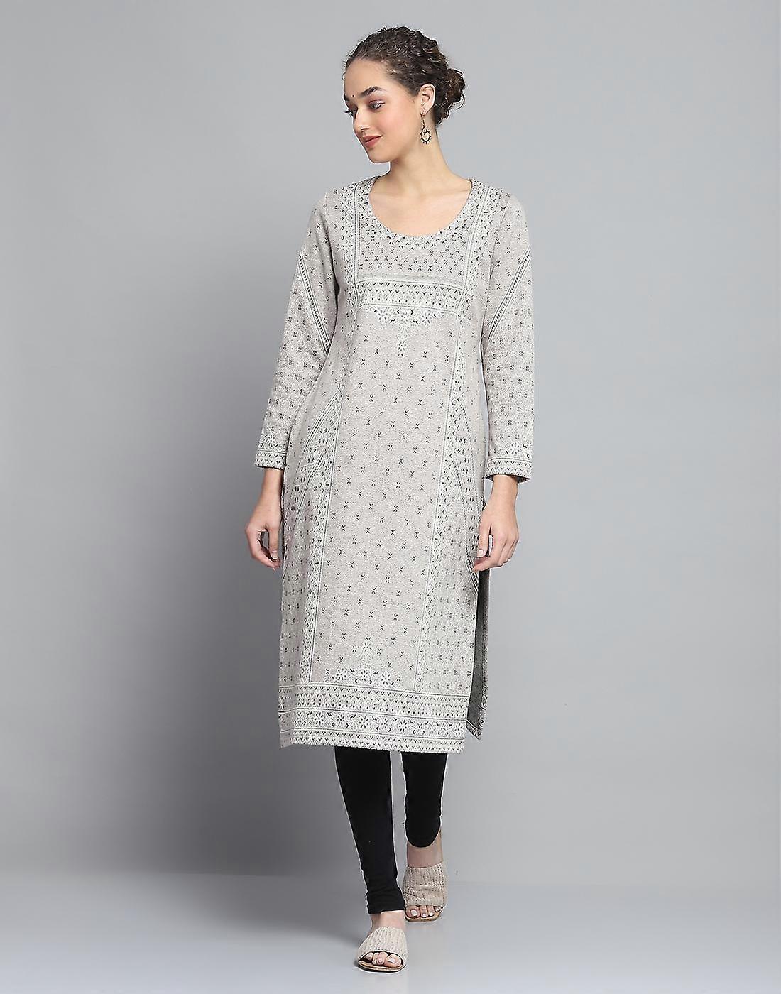 Monte Carlo Womens Self Design Beige Round Neck Full Sleeve Kurti