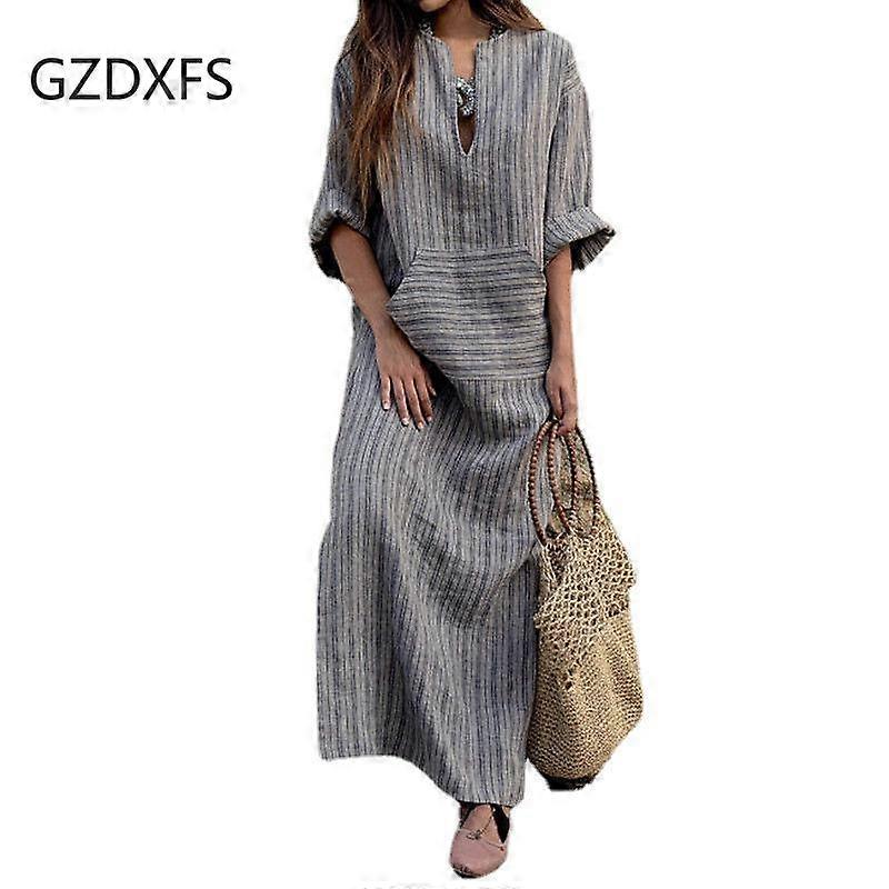 New Cotton Linen Yarn Dyed Striped Loose Long Dress