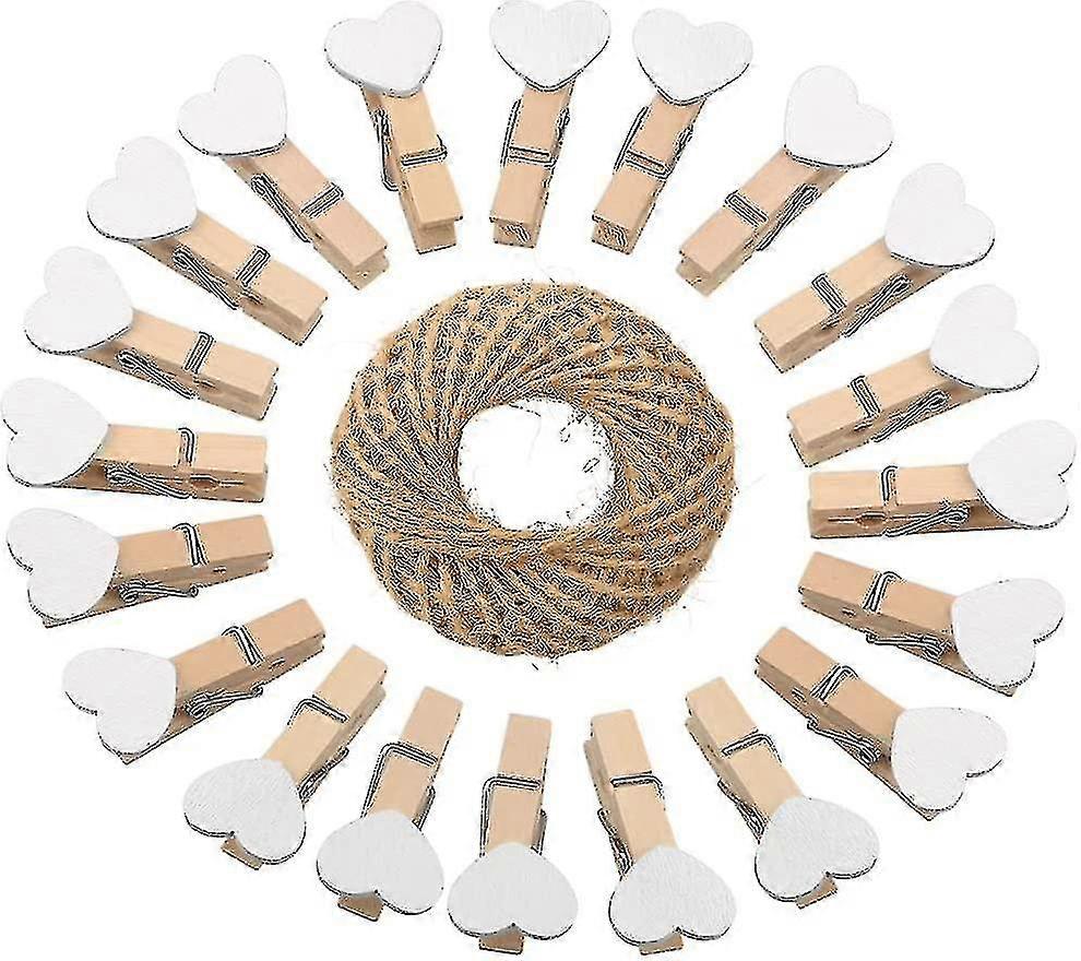 Pinces à linge en forme de cœur, 100 mini pinces à linge en bois, trombones photo blancs avec 30 mètres de jute
