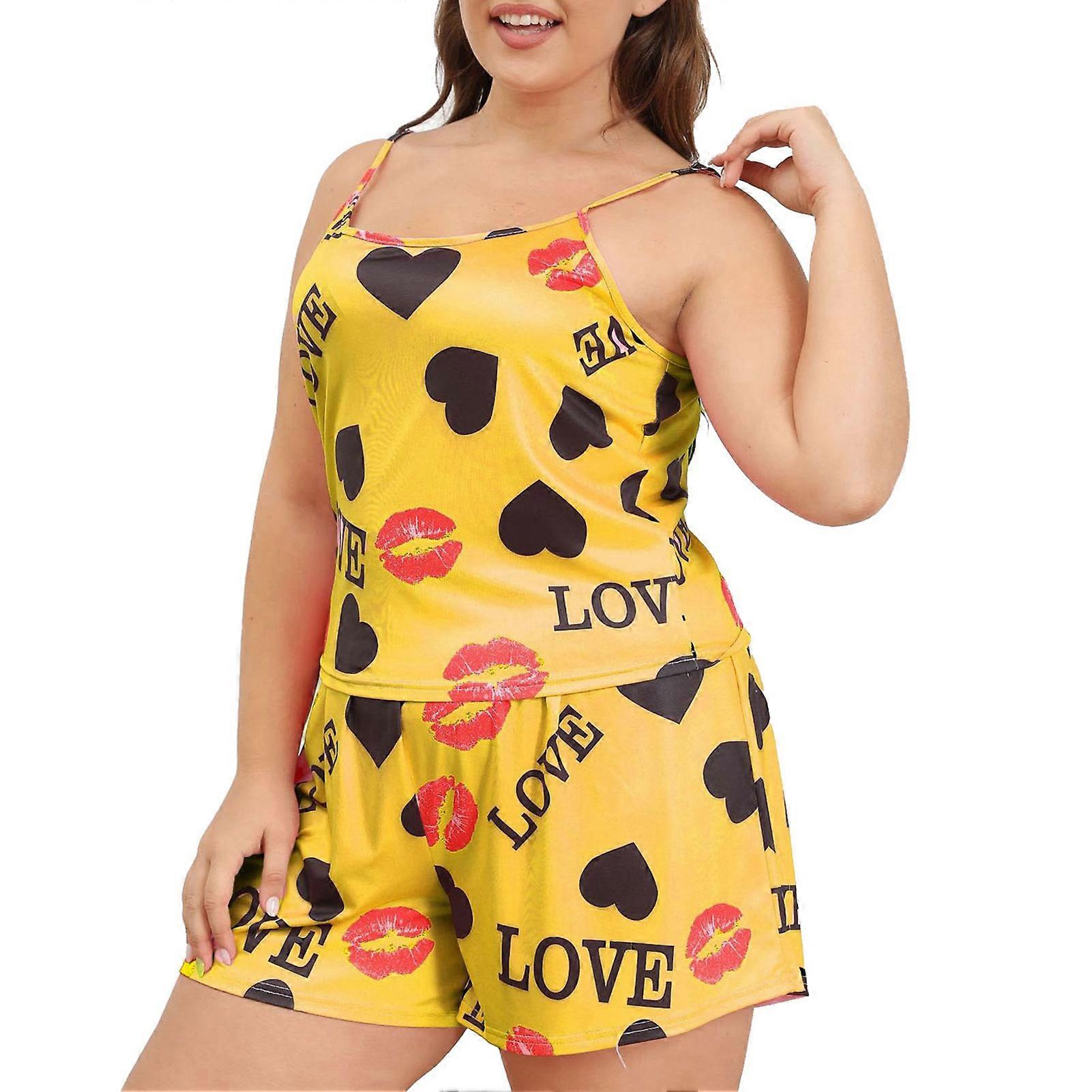 Short Pajamas Set Printed Casual Polyester Loungewear Suspender Top Shorts 2 Piece Yellow 2XL