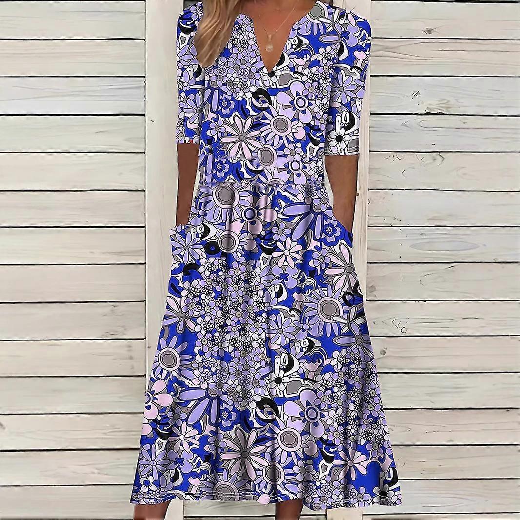 Women's Short sleeve V-neck loose printed elegant midi dress
