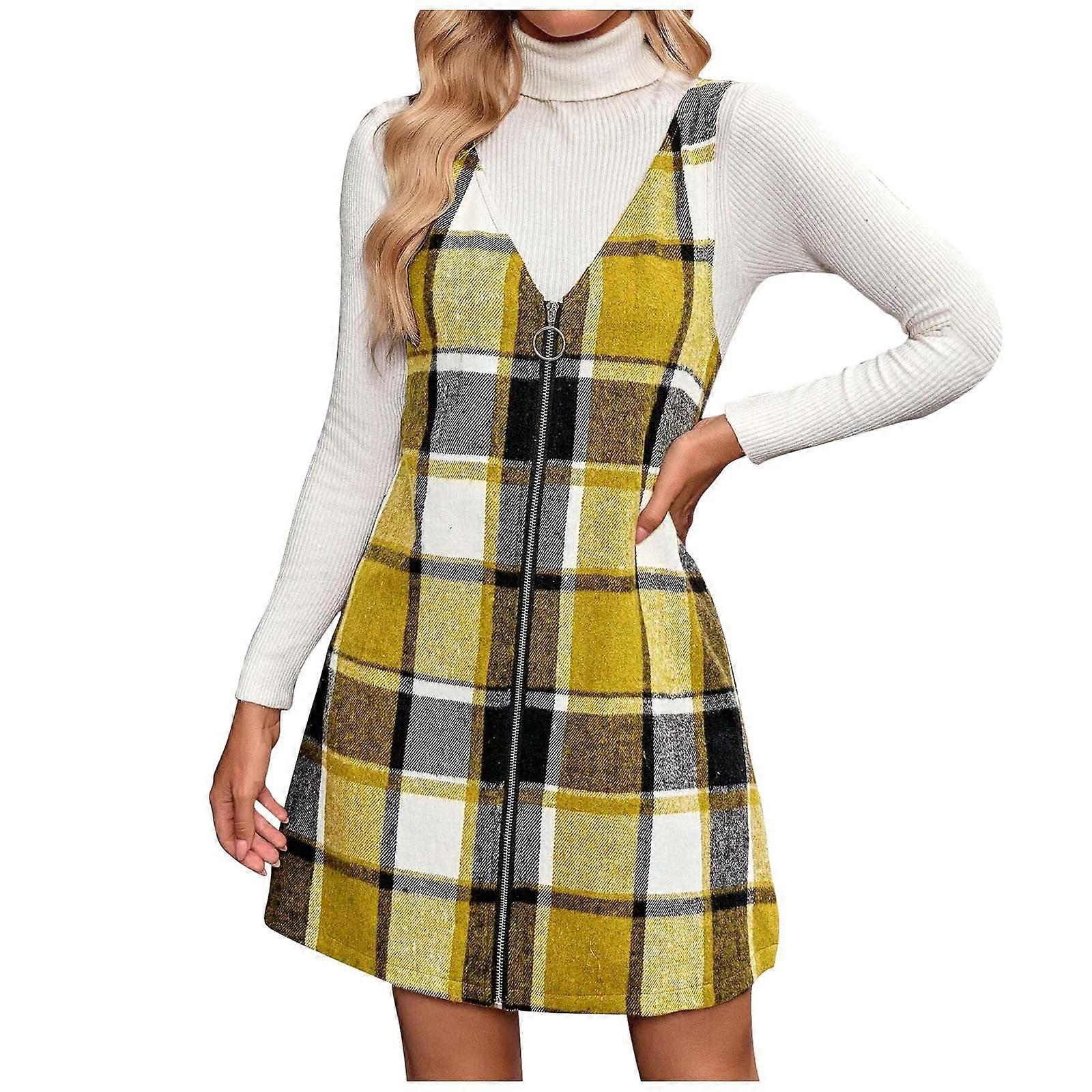 Dresses for Women V Neck Zipper Open Front Plaid Sleeveless Straps Dress Casual Vintage Color Block Mini Overall Dresses Yellow XL