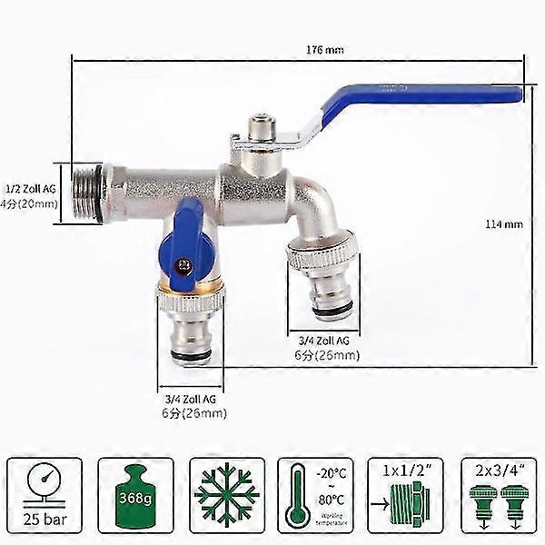 Double Outlet Garden Water Tap, 1/2 inch, Brass, Rust and Frost Resistant, with 2 Outlets 3/4 inch, 1 Waterproof Tape with Drum, Double