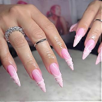 24 Pcs French Tip Press on Nails Medium Almond Pink Fake Nails with 3D Water Ripple Design, Glue On Artificial Nails for Women Girls