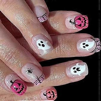 Faux ongles courts carrés à motif toile d'araignée et citrouille, résistants et non toxiques, multicolores, parfaits pour Halloween et les fêtes costumées.