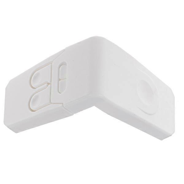 Corner Drawer Lock. Keeps little ones out of drawers. The locking mechanism consists of two L-shaped pieces that attach together. Each piece features a self-adhesive backing for easy installation. Made from cream-colored plastic. Dimensions: 7.5 cm each