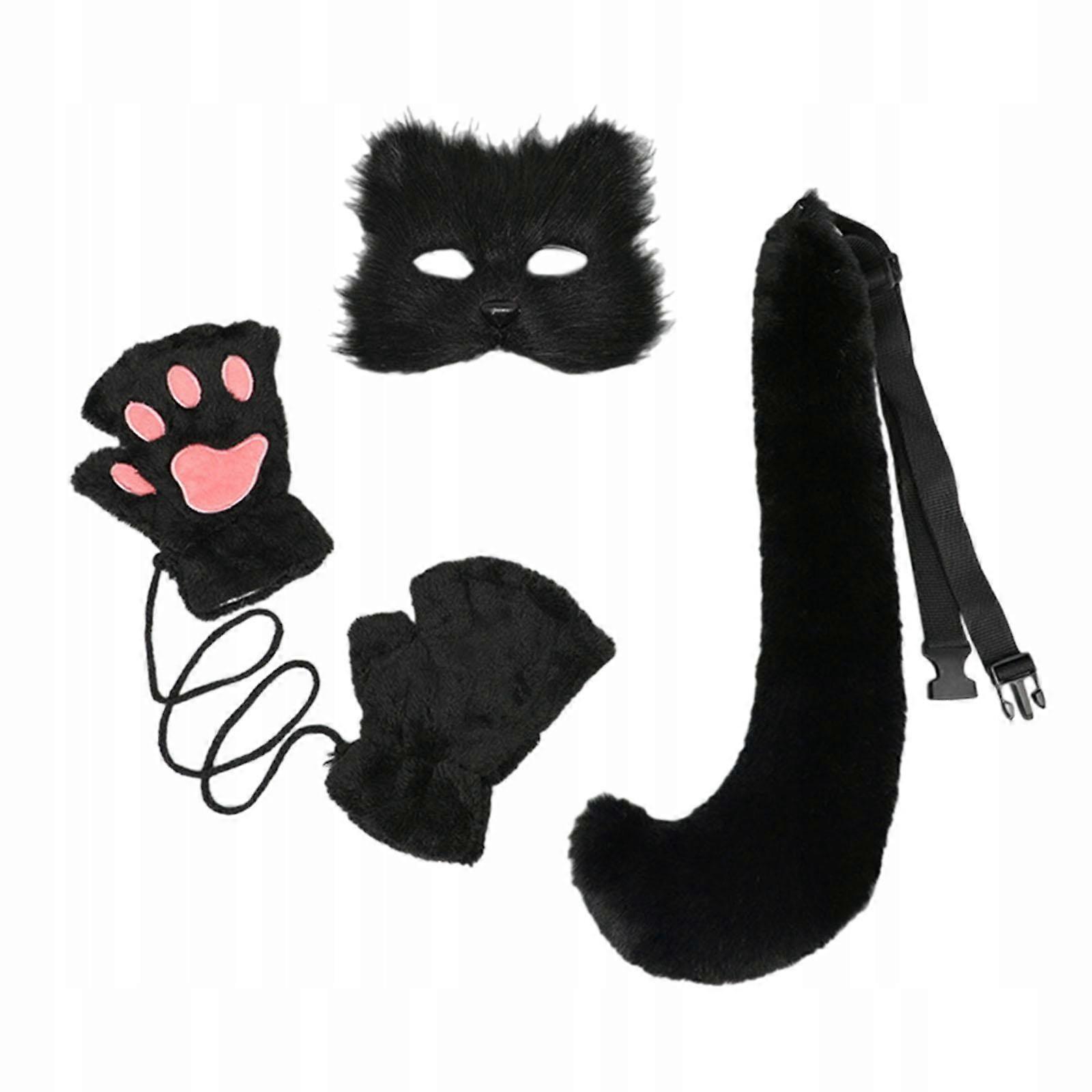 Therian Mask And Tail Set Cat Mask Animal Tail Gloves Set Black Short Hair